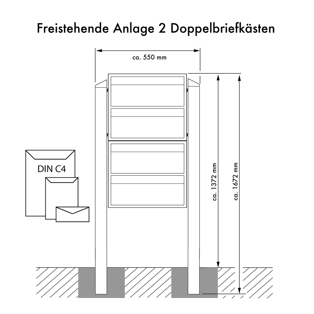 2 Modul mit 2 Postfächern, 2 Pfosten zum Einbetonieren, 2 Montage-Set |
