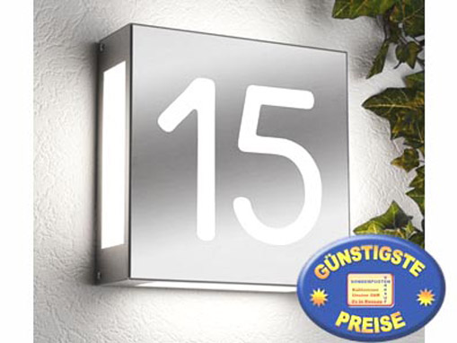 Und zwar Hausnummer mit Beleuchtung optisch gut „verpackt“ in einer modernen Edelstahl-Außenleuchte für die Wandmontage. Ein Hingucker für alle, die das Grundstück bzw. die Wohnanlage betreten. Weithin sichtbar strahlt die Leuchte und lässt die Hausnummer auch im Dunkeln deutlich erkennen. Design und praxistaugliche Anwendung sind hier in bester Weise vereint.