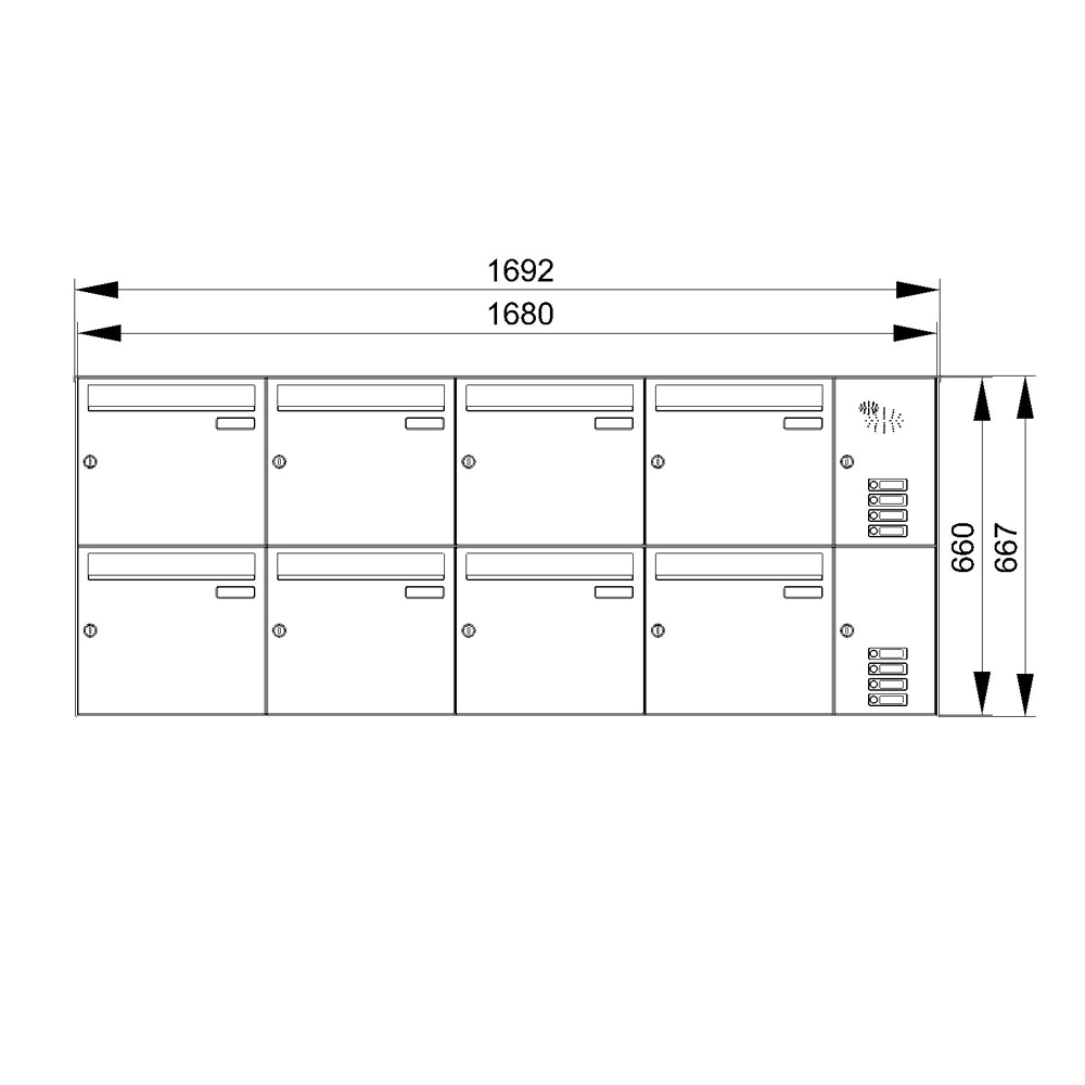 Anordnung und Größe des Funktionskastens ist abhängig von der Anzahl der Briefkästen. Standard-Ausrüstung inklusive Sprechsieb gelocht und ein durchdrücksicherer Antivandalismus-Klingeltaster je Kasten.