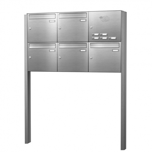 Briefkästen und Briefkastenanlagen aus Edelstahl sind zeitlos-elegant und passen zu jedem Haus. Sie erhalten eine hochwertige Standbriefkastenanlage mit Sprechsieb und Klingeltastern, die mit ihrem dezenten, modernen Look den Eingangsbereich verschönert. Der gebürstete Edelstahl ist witterungs- und rostbeständig und sehr pflegeleicht. Die freistehende Briefkastenanlage aus Edelstahl besteht aus fünf Briefkästen mit Installationskasten sowie zwei Standpfosten.